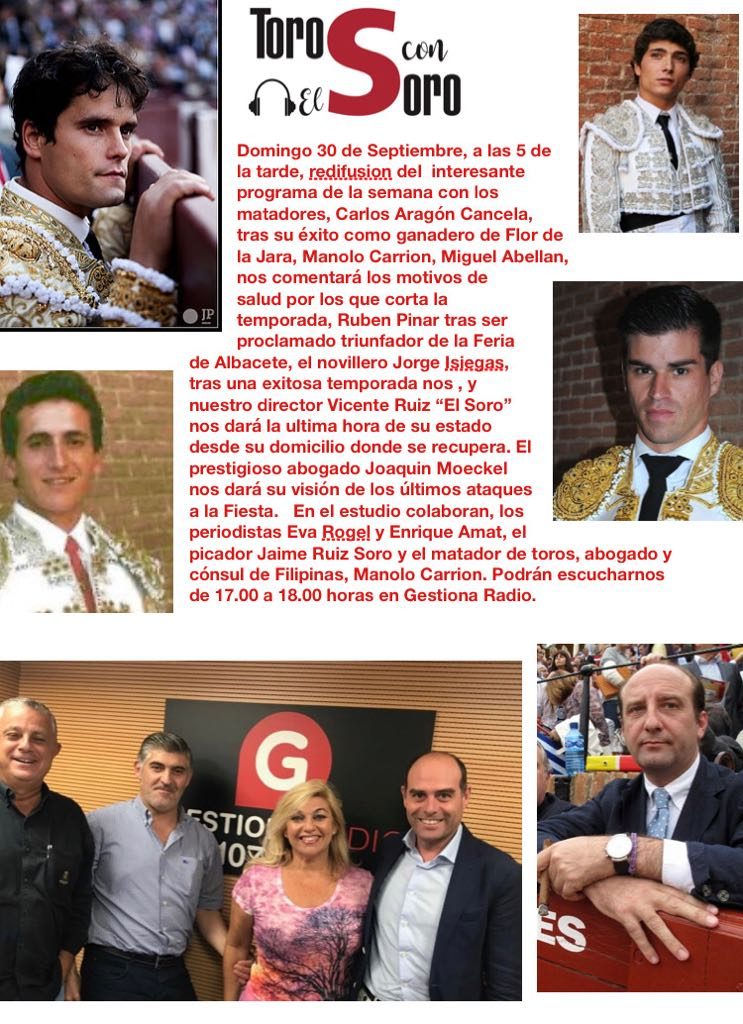 El programa TOROS CON EL SORO de Gestiona Radio, que dirige Vicente Ruíz el Soro junto a Eva Rogel y...