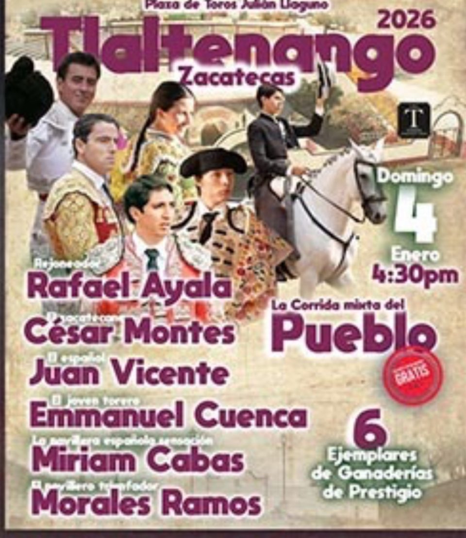 La empresa Casa Toreros dio a conocer la feria de Tlaltenango que este año estará conformada por dos espectáculos: una corrida de toros y un festejo mixto, a celebrare el 28 de diciembre y 4 de enero, en la plaza “Julián Llaguno”, en una de las citas de mayor relieve del estado de Zacatecas. En la misma…
