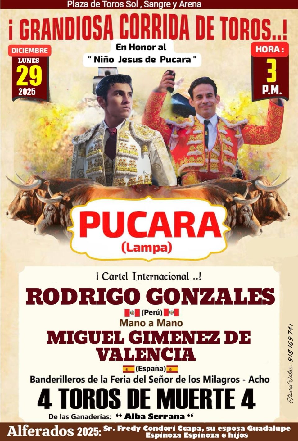 El matador de toros valenciano Miguel Giménez continúa su campaña por ruedos peruanos. Y así, el día 29 de diciembre hará el paseíllo en la plaza de Pucara ((Lampa), en una corrida de toros en honor al Niño Jesús de Pucara. Compartirá el cartel con local Rodrigo Gonzales en la lidia y muerte de cuatro toros de Alba…