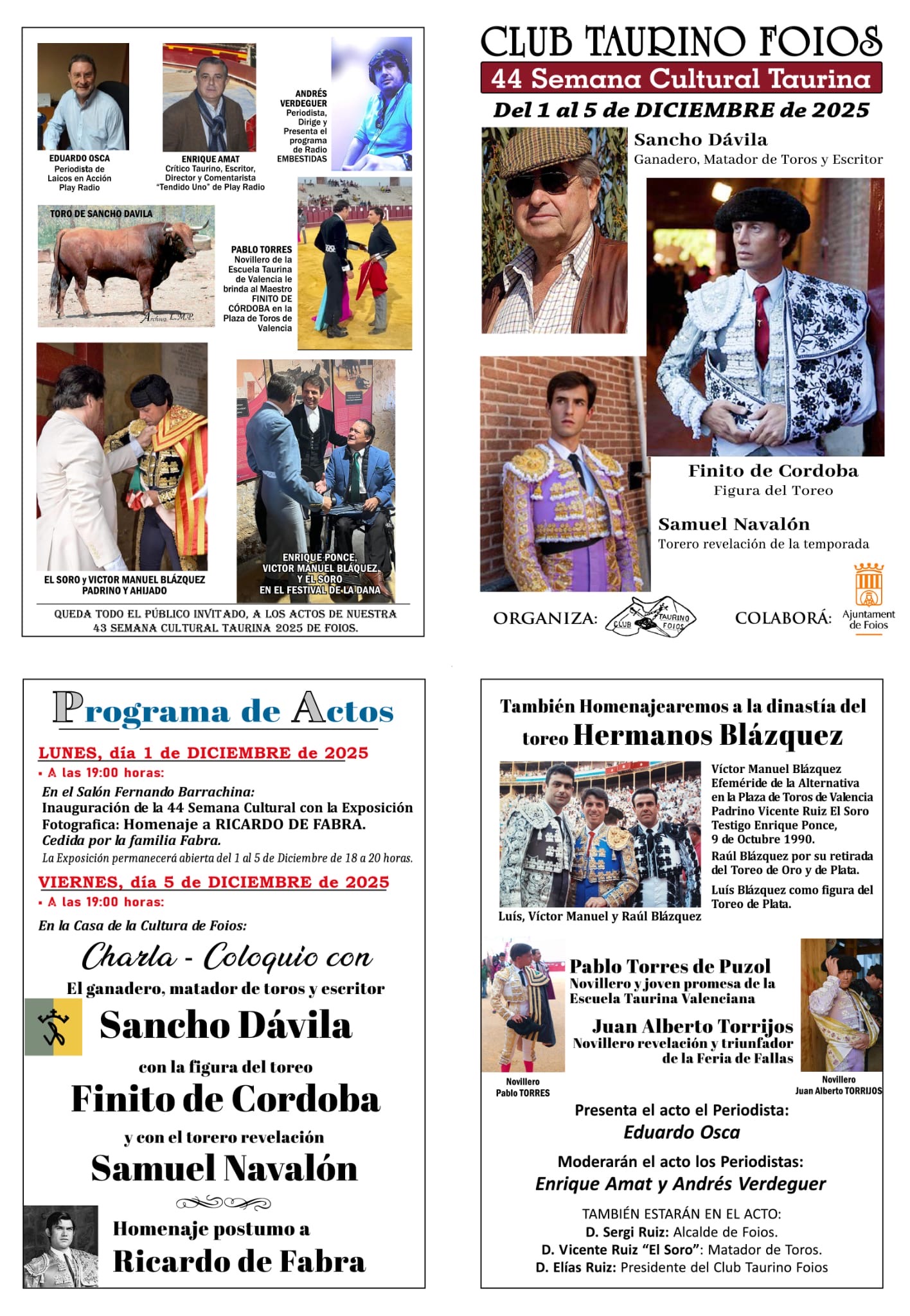 A las 19:00 horas: En la Casa de la Cultura de Foios. Charla Coloquio con el ganadero, matador de toros y escritor Sancho Dávila, y los matadores de toros Finito de Córdoba y Samuel Navalón. Presenta el acto Eduardo Osca.