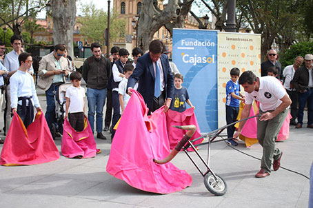 Más de 1.000 sevillanos y visitantes observaron y participaron en esta actividad que pretende que el público tenga un contacto directo con la tauromaquia a través del manejo de capotes, muletas y banderillas. Hasta un caballo de picar se utilizó en este encuentro, formándose colas para subir y fotografiarse sobre el animal.