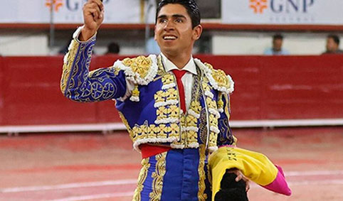Héctor Gutiérrez, de azul rey y oro, oreja y palmas.