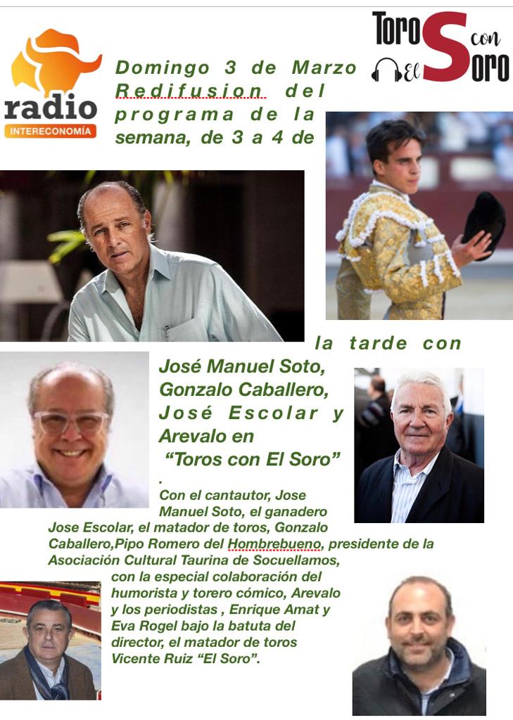 El programa TOROS CON EL SORO, ahora en su etapa en Radio Intereconomía, que dirige Vicente Ruiz el Soro junto con Eva Rogel, se puede volver a escuchar en radiodifusión esta tarde de domingo a partir de las 15.00 horas.