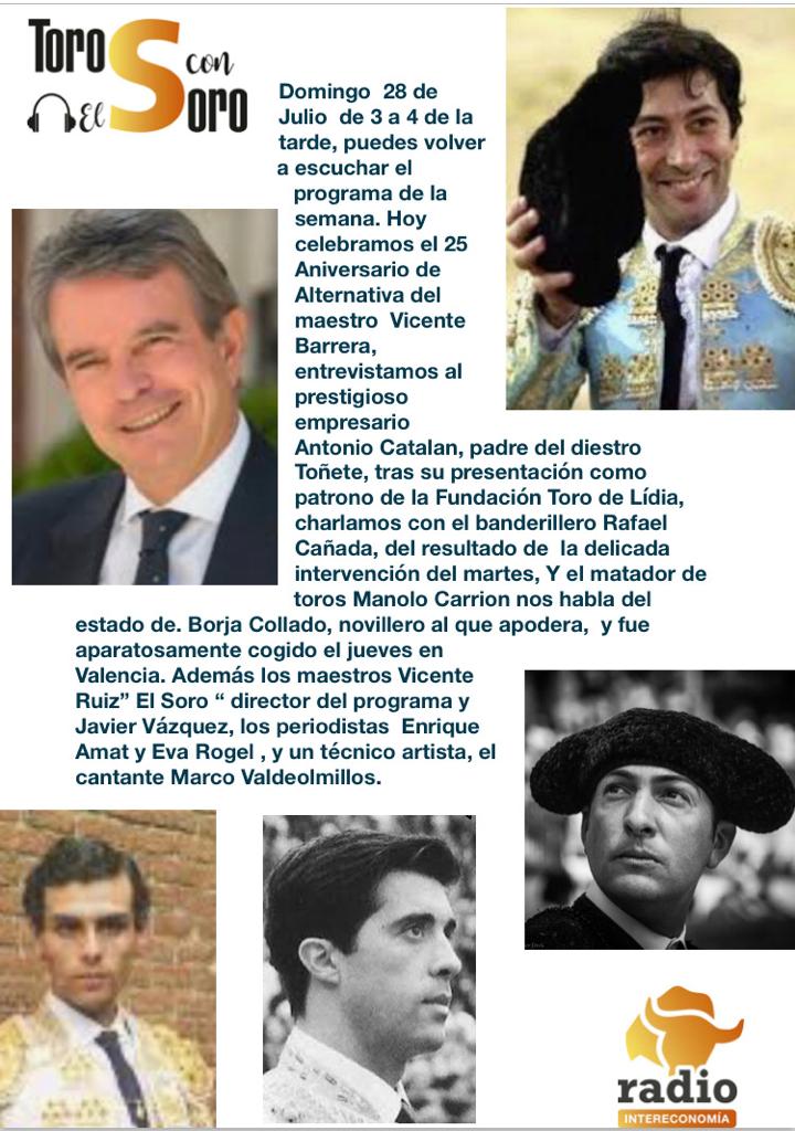 El programa TOROS CON EL SORO de Radio Intereconomía, que dirige Vicente Ruiz el Soro junto con Eva Rogel, se puede volver a escuchar la tarde de hoy domingo a partir de las 15.00 horas.