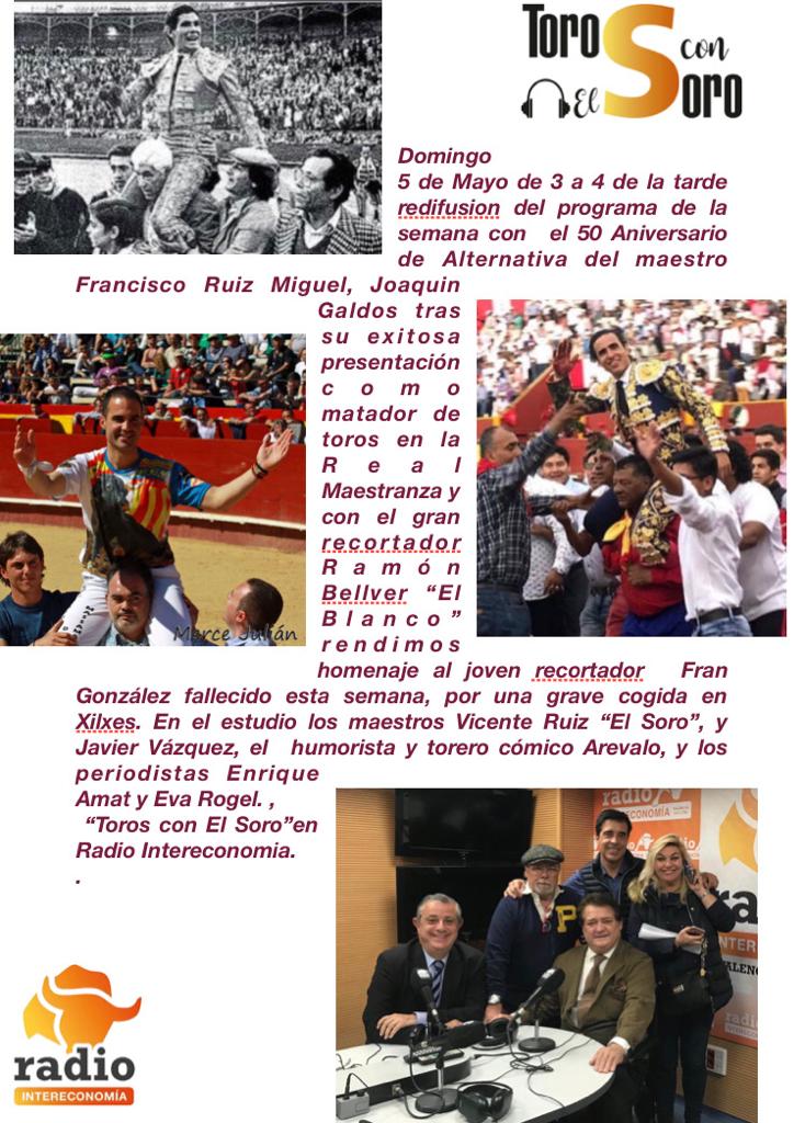 El programa TOROS CON EL SORO de Radio Intereconomía, que dirige Vicente Ruiz el Soro junto con Eva Rogel, se puede volver a escuchar este domingo a partir de las 15.00 horas.