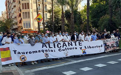 Coincidiendo con la fecha en la que, de no haber mediado coronavirus y sus nefastos efectos, se habría iniciado la feria de Hogueras, aficionados y profesionales tomaron la calle en Alicante para, en un paseo por distintas calles de la ciudad, manifestar su apoyo a una de nuestras mas representativas tradiciones y una muy significativa manifestación cultura, reconocida, ademas, por el Estado Español como “Patrimonio Cultural Inmaterial”: la fiesta taurina.