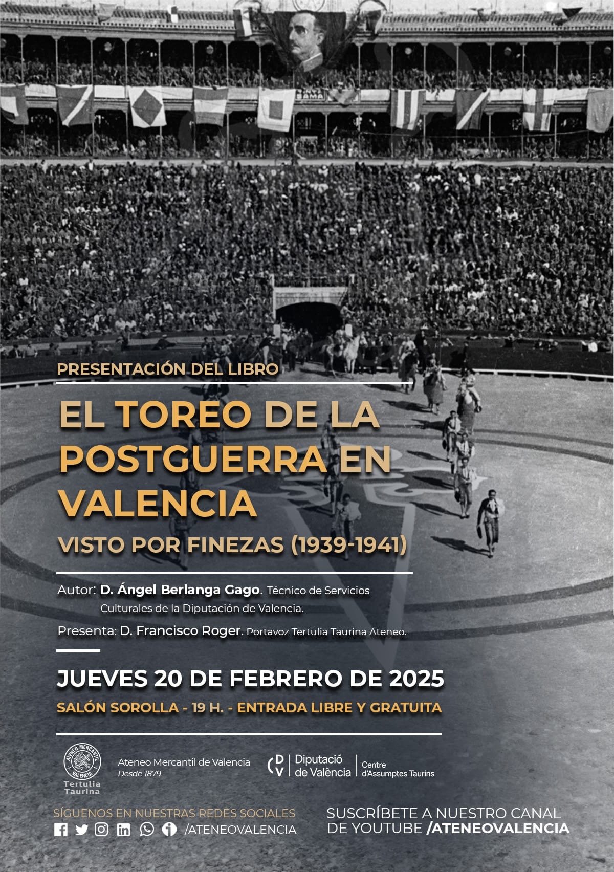 Se trata del titulado “El toreo de la postguerra en Valencia, visto por Finezas (1939-1941)“. Presidirá el acto el director del Centro de Asuntos Taurinos de la Diputación de Valencia, Toni Gázquez.