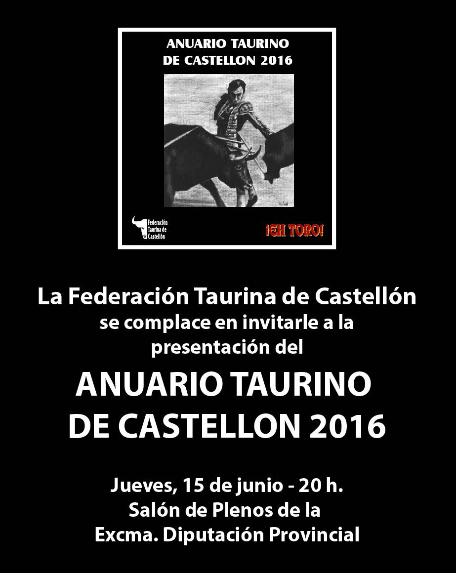 La Federación Taurina de Castellón que preside Ramón Quesada presenta el próximo jueves día 15 de junio el Anuario Taurino de Castellón 2016. En el se recoge un completo estudio de lo que fue la actividad taurina desarrollada en la ciudad y provincia a lo largo de la pasada campaña. Festejos celebrados, actuaciones de toreros locales, el resumen del curso de la escuela taurina, la actividad de las peñas y las publicaciones que vieron la luz en un volumen que ha sido coordinado por Pedro Mileo en colaboración con los componentes de la Unión de Aficionados La Puntilla. El acto comenzará a las 20 horas y se celebrará en el Salón de Plenos de la Excma Diputación Provincial de Castellón.