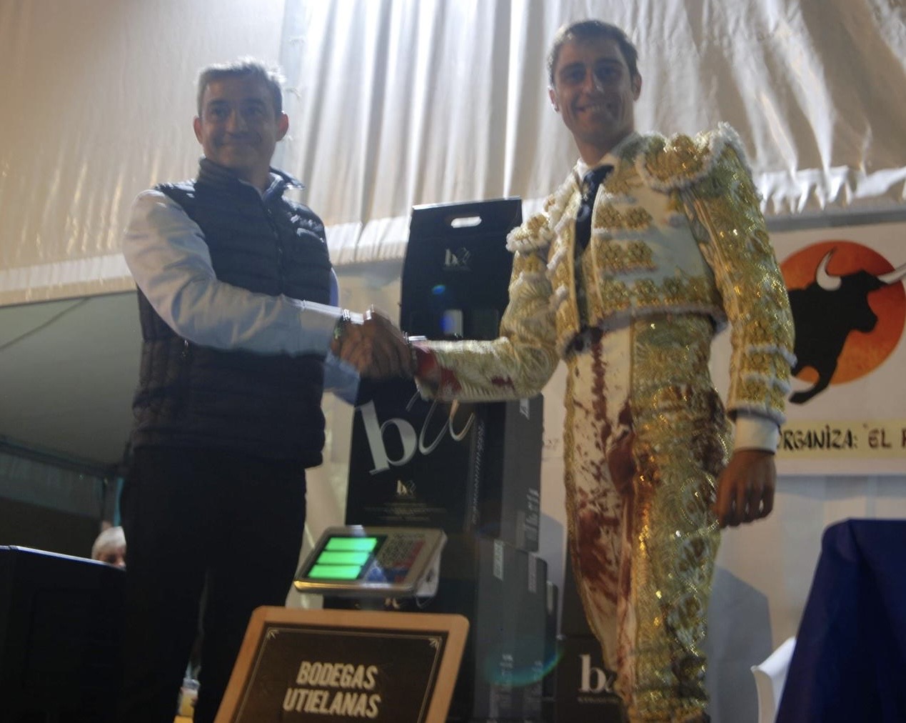 El matador de toros valenciano Jordi Pérez, Niño de las Monjas que ayer recibió la alternativa en la plaza de toros de Utiel, de manos de Alejandro Talavante, con Emilio de Justo de testigo, ue proclamado como triunfador del XX Trofeo ‘Taurino Sabor Torero Bodegas Utielanas, su peso en vino. Un galardón instituido por la tertulia taurina El redondel de Radio Utiel 107.7 FM y patrocinado por Bodegas Utielanas. Después de un ameno coloquio, en el que el nuevo matador comentó sus experiencias en la tarde, todavía luciendo el vestido de torear, y en el que respondió a las preguntas de Juan Manuel Sánchez Morate, Enrique Amat y Miguel Diaz, tuvo lugar el correspondiente pesaje que llevó a cabo Rafael Pérez, y recibió el equivalente de su peso en botellas de vino de las citadas Bodegas Utielanas en reconocimiento a la faena de mayor sabor torero de la corrida. La entrega corrió a cargo del gerente de las citadas bodegas y la tertulia también le hizo entrega de un diploma acreditativo de este galardón. también recibió un reconocimiento su banderillero David Esteve, quien en su momento ya se alzó con este mismo trofeo. Foto: Nacho Latorre
