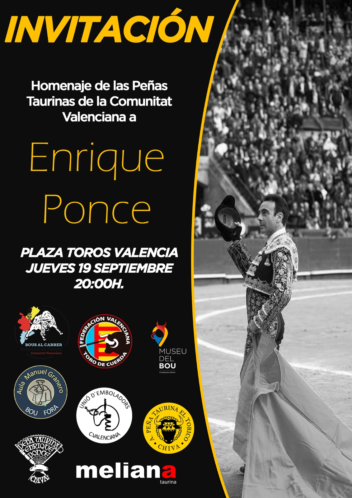 El próximo jueves 19 de septiembre, en la Plaza de Toros de Valencia, Enrique Ponce será homenajeado por hasta ocho entidades y asociaciones taurinas, principalmente vinculadas al bou al carrer y festejos populares. Promovemos este acto en reconocimiento a la máxima figura valenciana del toreo que ahora se despide de los ruedos. La Peña Taurina de Chiva, la Peña El Torico de Chiva, la Federación de Peñas de Bous al Carrer, la Federación del Toro de Cuerda, la Unió d´Emboladors, la Agrupación de Peñas taurinas de Meliana, el Círculo Taurino Manuel Granero y el Museo del Bou somos las entidades que convocamos este acto de reconocimiento en el ruedo de la Plaza de Toros de Valencia, con entrada libre. En el evento se vivirá, además, la puesta de largo del concurso de recortadores que, con motivo de la despedida del maestro de Chiva, se celebrará en la mañana del 9 de octubre. Todos los niños hasta 12 años que asistan al acto, recibirán una invitación para el concurso de recortadores.