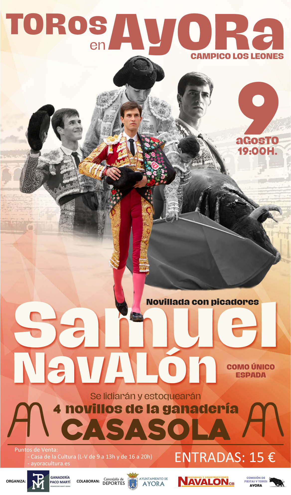 La localidad valenciana de Ayora será escenario de una novillada que se celebrará el próximo día 9 de agosto. En la misma, el novillero local Samuel Navalón, quien está anunciado para tomar la alternativa en Albacete, el próximo día 14 de septiembre, matará en solitario cuatro novillos. Alumno de la escuela de tauromaquia de Albacete, el espada nacido en Requena y afincado en Ayora este año ya ha toreado en plazas importantes como Valencia, Nimes, Santander, Madrid y Sevilla entre otras. En esta novillada, organizada por la empresa ganadería Paco Marti, que también está al frente de plazas como Bocairent, Requena y Villena, se lidiarán cuatro astados de Casasola, que serán estoqueados en solitario por el propio novillero valenciano en la plaza de toros situada en el "Campico los Leones". Samuel debutó con picadores el 18 de agosto de 2023 en Almería, y este año va a actuar en cerca de la treintena de novilladas. En la ropia plaza de Albacete será su despedida como novillero, y en la alternativa tendrá como padrino a José María Manzanares y Andrés Roca Rey será el testigo der la ceremonia. Respecto al festejo del viernes, Navalón resalta: “desde que era pequeño mi sueño era ser torero, y durante mi carrera siempre he recibido mucho apoyo por parte de la gente de mi pueblo. Torear en plenas fiestas es algo muy especial, y sobre todo lo hago en agradecimiento a todas aquellas personas de Ayora que se desplazan constantemente y hacen muchos viajes para verme torear”.