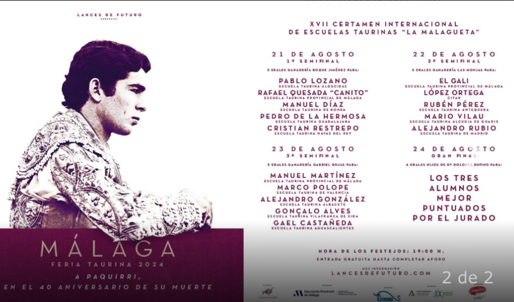 El alumno de la escuela de tauromaquia de Valencia, Marco Polope, está anunciado en la plaza de toros La Malagueta en el XVII Certamen Internacional de Escuelas Taurinas, en el que participarán trece escuelas taurinas de España, Portugal y México. Se celebrarán tres semifinales, cada una de ellas con cinco alumnos, y una final con los tres mejores alumnos seleccionados por un jurado. El premio para el triunfador será su participación en la novillada con picadores de la feria de agosto de 2025. El año pasado resultó triunfador el alumno de la escuela de tauromaquia de Valencia Simon Andreu, quien debutara con picadores este próximo mes de agosto en Málaga. Cinco de los participantes pertenecen a las escuelas de Ronda y Antequera y a la Escuela Taurina Provincial, que celebra este año su vigésimo aniversario. Además, participan las escuelas de Valencia, Algeciras, Albacete, Guadalajara, Centro Alto Rendimiento, Madrid, Alcudia de Guadix, Navas del Rey (que participa con un alumno colombiano), Vila Franca de Xira (Portugal) y Aguascalientes (México). En la primera semifinal, el 21 de agosto, están en cartel Pablo Lozano, Rafael Quesada “Canito”, Manuel Díaz, Pedro de la Hermosa y Cristian Restrepo. El 22 de agosto, en la segunda semifinal, participarán El Gali, López Ortega, Rubén Pérez, Mario Vilau y Alejandro Rubio. El 23 de agosto, en la tercera semifinal, estarán Manuel Martínez, MarcoPolope, Alejandro González, Gonçalo Alves y Gael Castañeda. Tres de ellos participarán el 24 de agosto en la final, con ganadería Dolores Rufino.