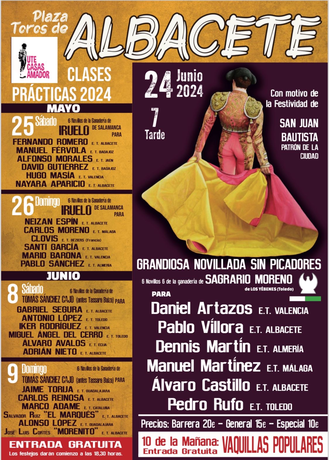 El alumno de la Escuela de Tauromaquia de Valencia Daniel Artazos está anunciado el día 24 de junio, en una novillada sin picadores que tendrá lugar en la plaza de toros de Albacete. Por su parte, el también alumno Hugo Masiá para lo propio en una clase práctica anunciada para el 25 de mayo, Mario Barona el 26 de mayo e Iker Rodriguez está anunciado el 8 de junio. Los carteles de estos festejos, organizados por la empresa UTE Casas-Amador que anuncia cinco espectáculos en la plaza de toros de Albacete durante los meses de mayo y de junio con el objetivo de potenciar el toreo en la ciudad, son los siguientes: Sábado, 25 de mayo. Clase práctica. Novillos de Iruelo. Fernando Romero (E.T. Albacete), Manuel Férvola (E.T. Badajoz), Alfonso Morales (E.T. Jaén), David Gutiérrez (E.T. Badajoz), Hugo Masía (E.T. Valencia) y Nayara Aparicio (E.T. Albacete) Domingo, 26 de mayo: Clase práctica. Novillos de Iruelo. Neizan Espín (E.T. Albacete), Carlos Moreno (E.T. Málaga), Clovis (E.T. Béziers), Santi García (E.T. Albacete), Mario Barona (E.T. Valencia) y Pablo Sánchez (E.T. Almería) Sábado, 8 de junio: Clase práctica. Novillos de Tomás Sánchez Cajo. Gabriel Segura (E.T. Albacete), Antonio López (E.T. Toledo), Iker Rodríguez (E.T. Valencia), Miguel Ángel del Cerro (E. T. Toledo), Álvaro Avalos (E.T. Écija) y Adrián Nieto (E.T. Albacete) Domingo, 9 de junio: Clase práctica. Novillos de Tomás Sánchez Cajo. Jaime Torija (E.T. Guadalajara), Carlos Reinosa (E.T. Albacete), Marco Adame (E.T. Cataluña), Salvador Ruiz “El Marqués” (E.T. Albacete), Alonso López (E.T. Guadalajara) y José Luis Cortés “Morenito” (E.T. Albacete) Lunes, 24 de …