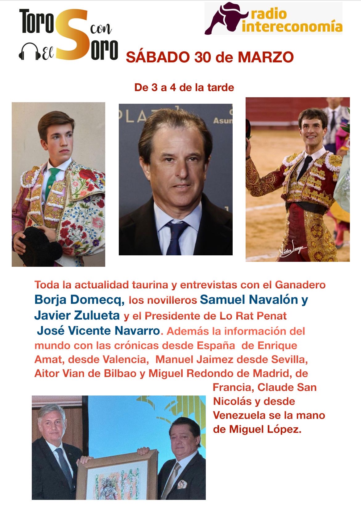Hoy miércoles, día 27 de marzo a las 21:00 horas, en Play Radio 107.7 FM, http://www.playradio.es, se emitirá el programa de información taurina TENDIDO UNO bajo la dirección de Enrique Amat. Su contenido cuenta con las siguientes secciones: - Desde el Tendido - El Tintero de Antonio Fuentes - El cuernómetro - La entrevista - Tal día como hoy: - Taurocultura La semana finalizó con los festejos del Domingo de Ramos, que fueron numerosos y el fin de semana que viene es uno de los más taurinos del año con los festejos de Sábado de Gloria y del Domingo de Resurrección. El sábado se inaugura la plaza de toros de Lorca con Paco Ureña como único espada y también se celebra la corrida Picassiana de Málaga. Y el domingo actúa Román en Madrid y en Sevilla se abre la temporada con un cartel integrado por Morante de la Puebla Sebastián Castilla y Roca Rey. Después de Fallas y Castellon, la temporada coge velocidad. Y en lo que hace referencia Valencia, donde se siguen concediendo trofeos de las fallas, se anuncian los festejos en Bocairent, el primero el próximo 5 de abril. Hoy intervendrá en el programa Pepe Luis Vázquez, quien debutó en esta plaza de Valencia el 13 de marzo de 1979. Posteriormente, fue testigo de la alternativa de Vicente Ruiz el 14 de marzo de 1982. Torero de dinastía, con él hablaremos de sus recuerdos de Valencia, de su ilustre progenitor y también de su sobrino Manuel Vázquez, quien está haciendo carrera en los …