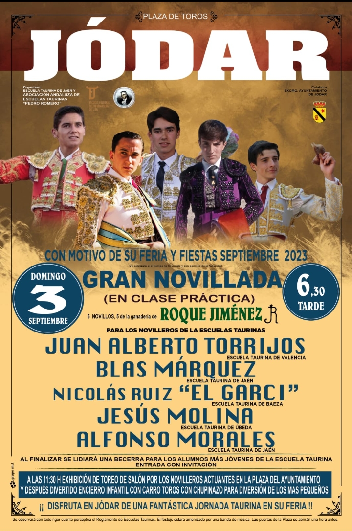 La escuela de tauromaquia de Valencia continúa con la incesante actividad de sus alumnos en los próximos días. Borja Navarro e Israel Guirao están anunciados en la plaza conquense de Huelamo el 2 de septiembre. El día 3, en la localidad jienense de Jódar actuará Juan Alberto Torrijos junto con Blas Márquez (ET Jaén), Jesús Molina (ET Baeza) y Alfonso Morales (ET Jaén) y el becerrista local Nicolás Ruiz ‘El Garci’. Ese mismo día en Benassal Alberto Donaire tomará parte en II Trofeo “Avellana de Oro lidiando erales de La Palmosilla junto a los castellonenses Pablo Vedrí, Bruno Martínez, Iker de Virgilio e Ian Bermejo Alberto también está anunciado el martes 5 de septiembre en la plaza conquense de Villalba del Rey, mano a mano con Miguel Losana, ante reses de Marcos Núñez. El 9 de septiembre hará el paseíllo en Morata de Tajuña para estoquear astados de Bellalucía en compañía de Fran Benito y Carrita El 10 de septiembre en Utiel,con reses de Juan Ruiz Palomares, intervendrán Juan Alberto Torrijos, Marco Polope, Borja Navarro, Bruno Gimeno y Álvaro Cerezo. Y el día 11 en Almonacid de Zorita Alberto Donaire se enfrentará a reses de El Torreón mano a mano con López Ortega.