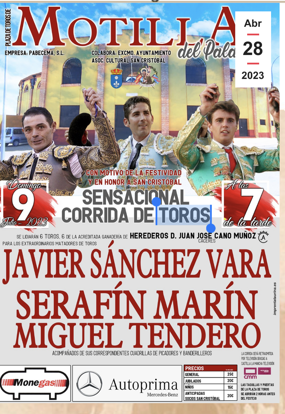 Domingo, 9 de julio de 2023. Plaza de toros de Motilla del Palancar. Media entrada en tarde muy calurosa. Toros de Juan Jose Cano Muñoz, de desigual presentación, y aunque escasos de raza, manejables el conjunto. Sanchez Vara (blanco y oro), oreja y dos orejas. Serafin Marin (rosa y oro), saludos y oreja tras aviso. Miguel Tendero (blanco y oro), dos orejas y oreja. Entre las cuadrillas destacó la brega de Sergio Pérez. Presidió Julián Moreno. Tras el paseíllo se guardó minuto de silencio en memoria de Víctor Barrio. Enrique Amat, Motilla del Palancar La empresa “Pabecema” S.L. con su gerente José Manuel Rozalen a la cabeza y en colaboración con el Ayuntamiento de la ciudad y la asociación cultural San Cristóbal, organizaron una corrida de toros en la plaza de toros de Motilla del Palancar. Un festejo con motivo de las fiestas de San Cristobal de esta localidad conquense y que contó las camaras de Castilla La Mancha TV en directo. Un festejo fuera de los circuitos, pero que revela la autenticidad de la fiesta de los toros. Aquella que retrató, entre otros, Ángel María de Lera, en su novela"Los clarines del miedo." Toros en La Mancha, con un calor africano, y un público con enormes deseos de pasarlo bien. ambiente festivo y algo solanesco. En una plaza que en su momento remozaron, y que tiene un sabor especial. Preciosa y cuidada. Y aún con el recuerdo del recientemente fallecido novillero utielano Joaquin Ivars Ivarito, prestos a presenciar el festejo. Los toros de Juan Jose Cano Muñoz, algo desigualmente presentados y variados de pelaje, resultaron manejables, aunque no anduvieron sobrados de clase ni de raza. Serio, con volumen y …