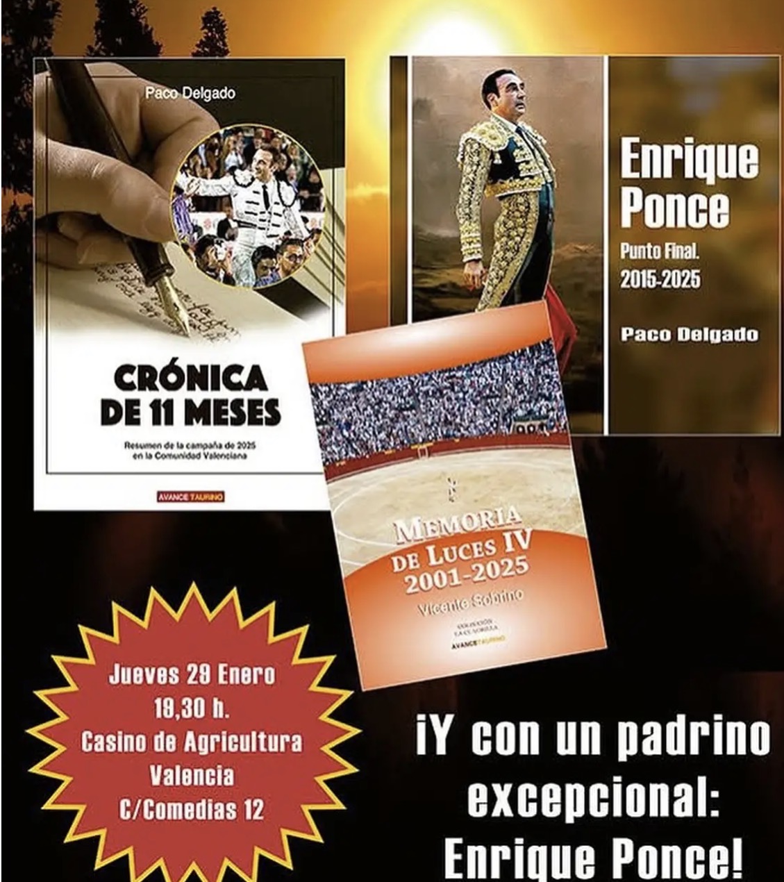 El Foro Taurino del Casino de Agricultura de Valencia, sito en el número 12 de la calle Comedias de Valencia, será marco el jueves, día 29 de enero de 2026, a las 19.30 horas, de la ya tradicional presentación de los libros que cada año edita Avance Taurino. En este caso vuelven a ser tres los volúmenes que engrosan una colección de libros que ya supera de largo los 150 ejemplares. Intervendrán en el acto: – Paco Delgado. Autor de los libros “Crónica de 11 meses”, habitual resumen de la temporada taurina en la Comunidad Valenciana y “Enrique Ponce: punto final (2015-2025)”. – Vicente Sobrino. Autor del volumen cuatro de “Memoria de luces”, que trata de los últimos 25 años en la plaza de toros de Valencia. – Enrique Ponce. Matador de toros. Ganadero y apoderado. - Javier Hurtado. Crítico taurino de RTVE. – Enrique Amat. Director del Foro Taurino del Casino de Agricultura de Valencia.
