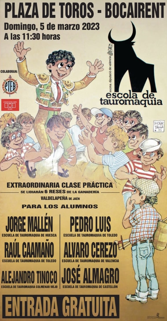 La plaza de toros de Bocairent abrirá sus puertas el próximo día 5 de marzo para ser escenario de una clase práctica organizada por la escuela de tauromaquia de Valencia, en compañía de la Peña taurina Espla de Bocairent y la Asociación Cultural Taurina de esta ciudad. En la misma se van a lidiar astados de Valdelapeña para un sexteto compuesto por Álvaro Cerezo de la escuela de tauromaquia de Valencia; Jorge Mallen, de la escuela taurina de Huesca; Raúl Caamaño de Toledo; Alejandro Tinoco de Colmenar Viejo; Pedro Luis, de Toledo y Vicente Almagro de la escuela de Castellón. El festejo comenzará a las 11:30 de la mañana, y supondrá la apertura oficial de la temporada taurina en la Comunidad Valenciana. La entrada a la plaza será de carácter gratuito.