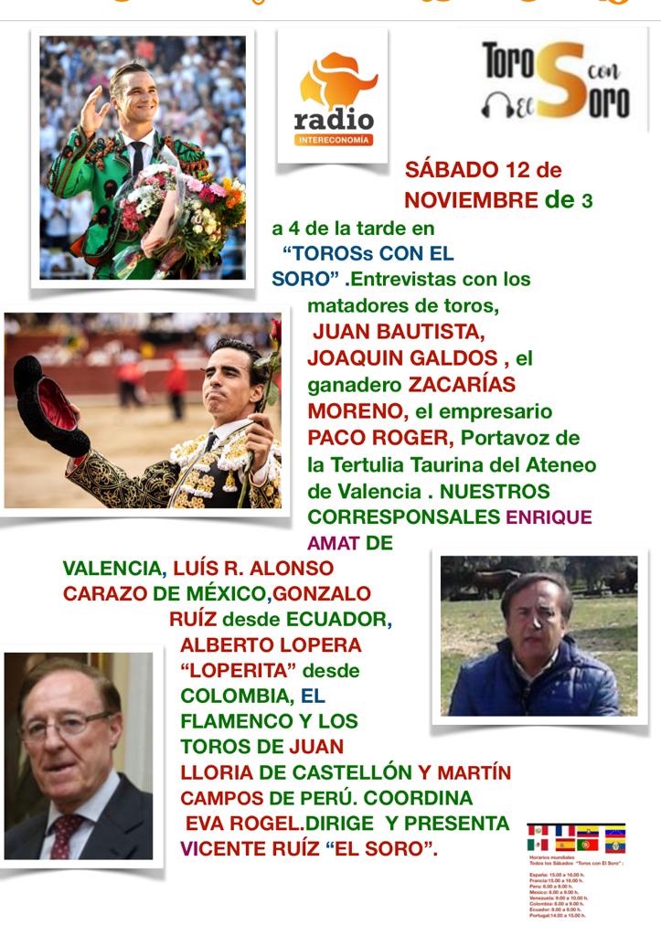 Hoy miércoles, día 23 de noviembre a las 21:00 horas, en Play Radio 107.7 FM, http://www.playradio.es, se emitirá el programa de información taurina TENDIDO UNO bajo la dirección de Enrique Amat, que cuenta con las siguientes secciones: - Desde el Tendido - El Tintero de Antonio Fuentes - El cuernómetro - La entrevista - Tal día como hoy: - Taurocultura La temporada se sigue desarrollando en ruedos mexicanos y asimismo Ecuador Colombia y Perú programan un buen número de festejos. Esta noche en Valencia se entregan los premios taurinos de la Diputación a los triunfadores de las ferias de fallas y julio, con especial protagonismo para Andrés Roca Rey, el Niño de las Monjas y la ganadería de Victoriano del Río. Y el pasado sábado, en Tinto y Oro, la Asociación de Amigos de Manolo Montoliu y Curro Valencia entregó su premio al banderillero Fernando Sánchez y una distinción al veterinario Gerardo Rojo. Hablando de distinciones, Jaime Ruiz Soro recibió una distinción académica el pasado sábado. Fue reconocido por la Academia Internacional de Ciencias, Tecnología, Educación y Humanidades con el título de Académico de Honor. Con una brillante carrera en los ruedos que concluirá en 2023, hablará esta noche de estos premios y de su trayectoria como picador. También estará en antena el matador de toros y apoderado Lazaro Carmona. Un torero que se anunció en los ruedos de hasta tres formas distintas: Sánchez Linares, Diego Sánchez y Lazaro Carmona. Coletudo de Linares y de excelente concepto, en los años 70 paseó su torería por los ruedos. Luego hizo del apoderamiento su profesión, y su último poderdante es el espada salmantino Juan del Álamo, con buen cartel en Valencia y provincia. Con …
