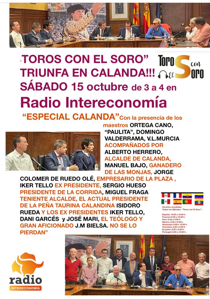El programa “Toros con el Soro”, de Radio Intereconomía, que se emite hoy 15 de octubre de 2022 de 15.00 a 16.00 horas, dedica un especial desde la localidad turolense de Calanda En el mismo toman parte los matadores de toros Ortega Cano, Paulita, Domingo Valderrama y Vicente, Luis Murcia, acompañados por el alcalde de la localidad, Alberto Herrero. También van a intervenir Manuel Bajo, ganadero de las Monjas, Jorge Colomer de la empresa Ruedo Olé queregenta el coso de Calanda, el expresidente Iker Tello y el presidente de la corrida. Sergio Hueso. Asimismo Miguel Fraga, teniente alcalde, el presidente de la peña taurina Calandina Isidoro Rueda y los expresidentes Dani Garcés y José Mari. Y no faltará la presencia del gran aficionado y teólogo José María Bielsa.. Todo ello con la dirección de lidia de Eva Rogel, bajo la batuta del director del programa, Vicente Ruiz El Soro.