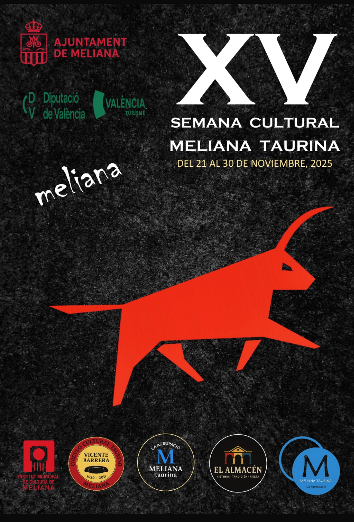 Se ha hecho público el cartel de la XV Semana Cultural Taurina de Meliana. Viernes, 21 de noviembre del 2025-. 17:00 h. Programa de radio "Toros con El Soro" que hará un repaso al año taurino de Meliana. 19:00 h. Inauguración de la XV Semana Cultural Taurina de Meliana a cargo del periodista taurino Jorge Casals y entrega de los GalardonesTaurinos de la localidad, así como los Premios Taurinos 2024 / 2025. La actividad museística de este año está dedicada al reconocido Mayoral de Las Ventas "FLORITO", así como un repaso de las temporadas taurinas 2024 y 2025 con imágenes de los artistas Rafi, Jesus Díaz, Jota, Javier Bellon, David Molina y Juan Legua. El artista local Rafa Mir vestirá la exposición con su nueva colección de esculturas y el maestro de la taxidermia local Jose Ros, expondrá su último trabajo con dos toros disecados de Victorino Martín. Los galardonados de este año son "Florito", Vicente Barrera, Vicente Ruiz El Soro, Avance Taurino, familia Ros Galindo y Meliana CF. 22:00 h. Cena de Gala con el tradicional Tombet de Bou. Miércoles, 26 de noviembre del 2025-. Encuentro de trabajo, intercambio de pareceres y acuerdos de colaboración con los integrantes de la Policia Local de Meliana y la Policia Autonomica. Jueves, 27 de noviembre del 2025-. Fallo del Jurado del I Certamen de Fotografía Taurina Vicent Capilla de Meliana. Todos los actos se realizarán en la Plaza de la Cultura de Meliana.