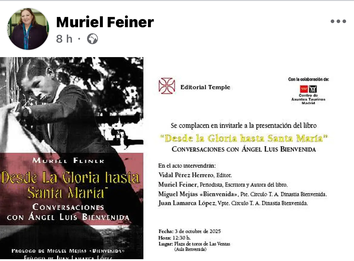 El próximo día 3 de Octubre a las 12.30 hrs en la Plaza de Toros de Las Ventas - Aula Antonio Bienvenida tendrá lugar la presentación del libro "Desde la Gloria a Santa María" CONVERSACIONES CON ÁNGEL LUIS BIENVENIDA, de Muriel Feiner. Intervendrán en el acto: Vidal Pérez Herrero, editor; Muriel Feiner, periodista, escritora y autora del libro; Miguel Mejías "Bienvenida", Pte. del Círculo T. A. Dinastía Bienvenida y Juan Lamarca López, Vpte. del Círculo T. A. Dinastía Bienvenida. Según la autora: "Fue un honor y un privilegio para mí emprender este proyecto con el maestro, pero lamentablemente Ángel Luis falleció antes de que pudiéramos darlo por terminado. Decidí que debía seguir adelante con el libro porque creo firmemente en el gran valor de la memoria histórica taurina y la necesidad de dejarla escrita para enseñar y lustrar generaciones venideras. Él tenía muy claro desde el principio el curioso título: “DE LA GLORIA —la añorada finca sevillana de la familia— A SANTA MARÍA” —El Sacramental donde reposan los restos mortales de todos los Bienvenida en el mausoleo familiar."