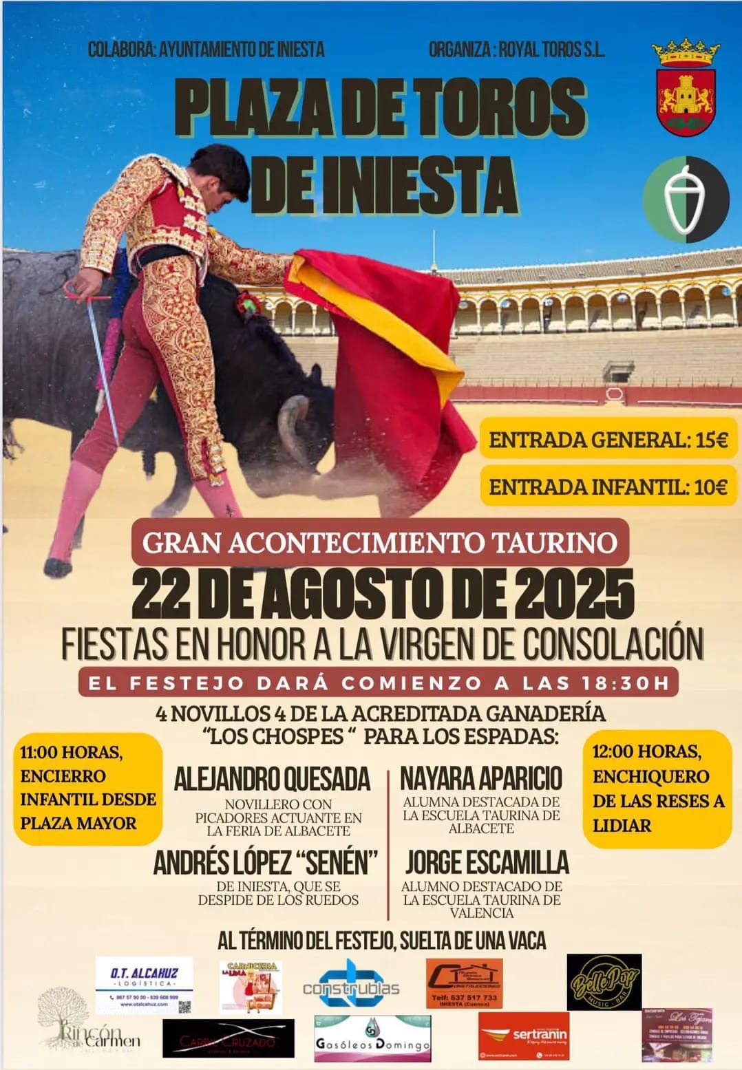 El alumno de la escuela de tauromaquia de Valencia, Jorge Escamilla está anunciado el próximo 22 de agosto en la plaza conquense de Iniesta. Será en una novillada sin picadores, con motivo de las fiestas de la Virgen de la consolación y que organiza la empresa Royal Toros. En ella se van a lidiar astados de Los Chospes y completan el cuarteto de actuantes Alejandro Quesada, Nayara Aparicio y Adrián López Senén, coletudo de Iniesta, quien se despide de los ruedos.