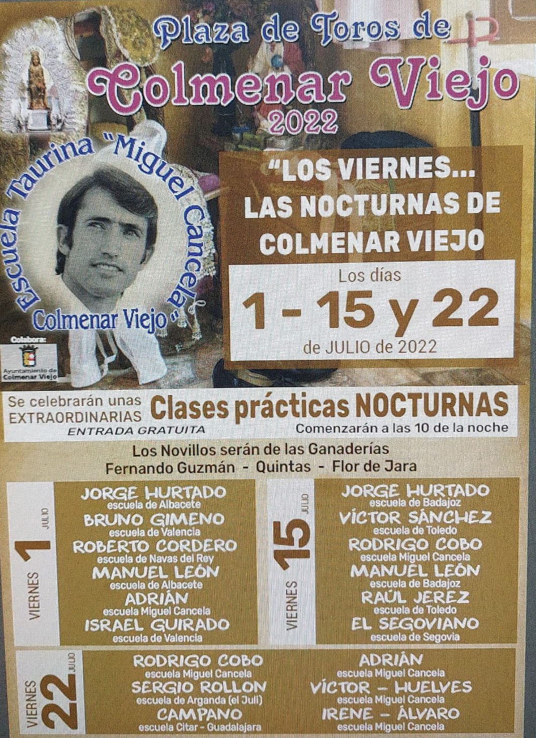 Se trata de un festejo en el marco del Certamen: “”Los Viernes, Las nocturnas de Colmenar Viejo” organizado por la escuela taurina Miguel Cancela de Colmenar. Las novilladas están programadas para los días 1,15 y 22 de julio.