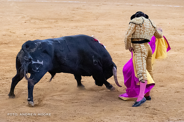 Al bien hecho, cornidelantero, negro mulato y bajo primero de Pablo Aguado le saludó con unas verónicas a pies juntos y remató en los medios a una mano con media de rodillas. Excelente resultó el quite por verónicas con reunión, temple, media y remate a una mano andándole al toro. Cuajó muletazos con su sello por ambos pitones con gusto, a media altura, cadencia y lento cambio de mano. El toro se fue apagando y finalizó su faena al natural, citando de frente y a pies juntos rematando en la cadera.