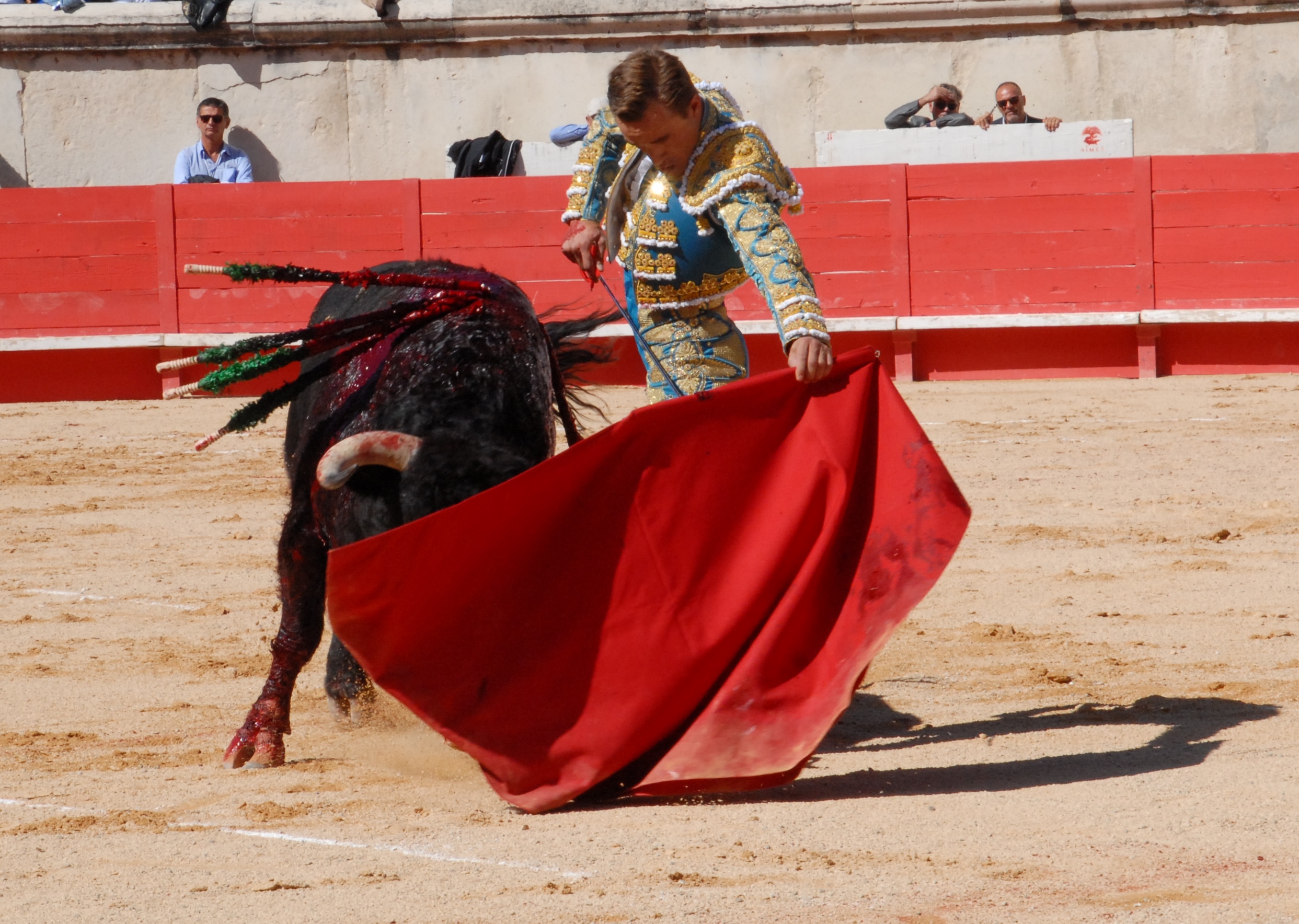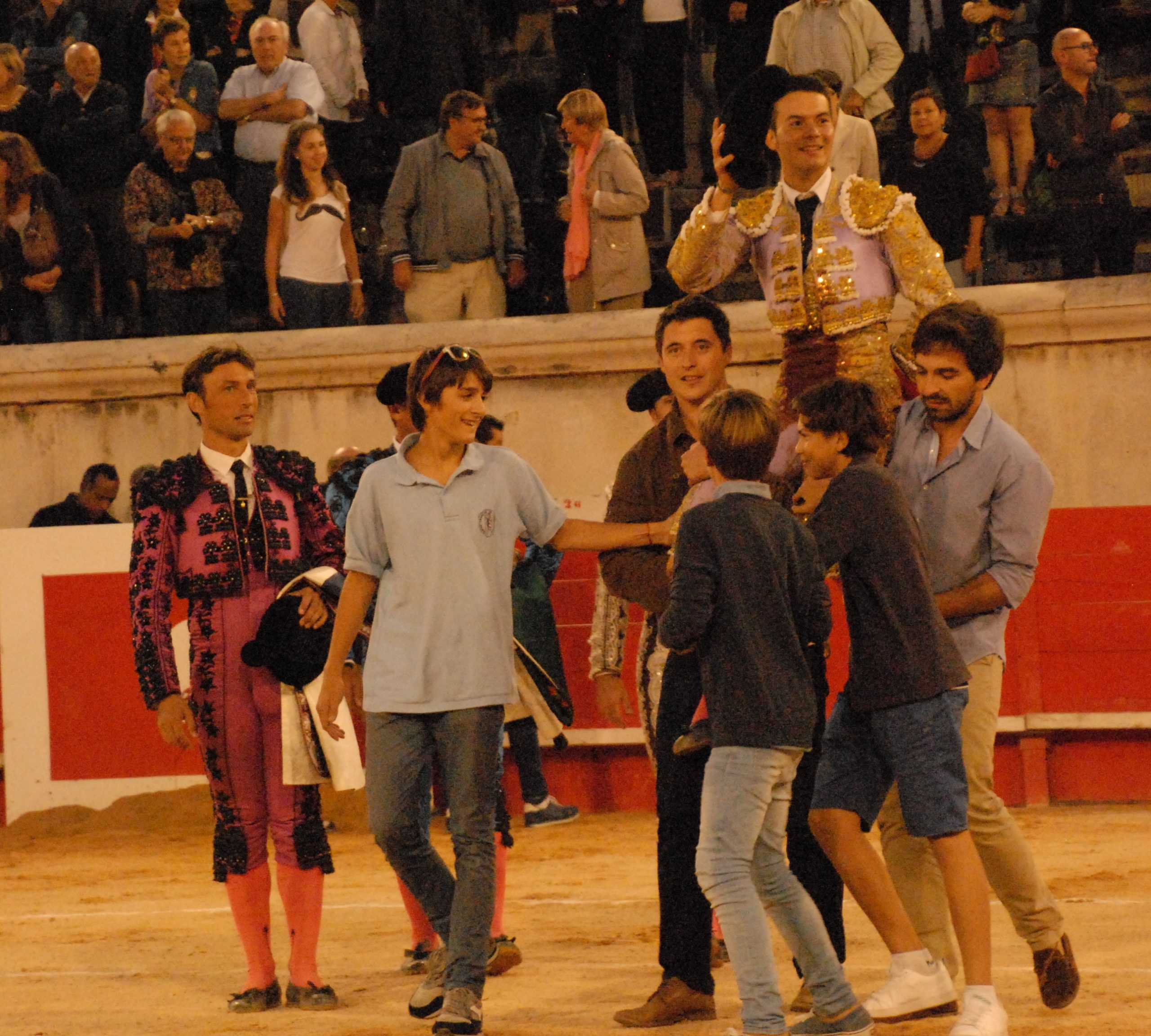 Manolo Vanegas triomphateur: oreille et oreille Seules quelques gouttelettes éparses rappelèrent la nuit pluvieuse, enfin la pluie ! Novillada de lever de rideau: ganaderia française San Sebastian, un premier pas d’importance dans une grande arène. Bien présentés : les deux premiers et le sixième applaudis à la sortie du toril, nobles et suaves à la fois, des qualités qui se seraient mieux exprimées avec un plus de bravoure. ManoloVanegas. Lilas et or. Estocade: oreille. Demi lame: oreille malgré une longue attente pour voir le novillo mettre genou en terre. Vaillance largement exprimée bien connue, Manolo avance certes, on regrettera qu’il n’ait pas encore affirmé sa personnalité, apporté ce petit plus qui le caractériserait, le différencierait dans le courant monocorde que la tauromachie actuelle semble goûter. Andy Younès. Evêque et or . Estocade : vuelta. Estocade: oreille. Il a triomphé partout le bel arlésien foulant les pistes avec une grâce , un détachement altiers. Il a tous les dons ou presque y compris la vaillance : son cite à genoux, à distance, en milieu de seconde faena en atteste : violemment choqué en pleine poitrine, culbuté, quasi asphyxié, la démarche plus qu’hésitante, il fut digne de la profession avant de reprendre le combat et de passer à l’infirmerie, encore choqué. Tous les dons disais-je, mais à travailler encore et il pourra envisager une belle suite u niveau supérieur. Tibo Garcia .Cendre et argent. Pinchazo, estocade caìda, avis : ovations et saluts. Demi épée : oreille. Il est, il fut la surprise …