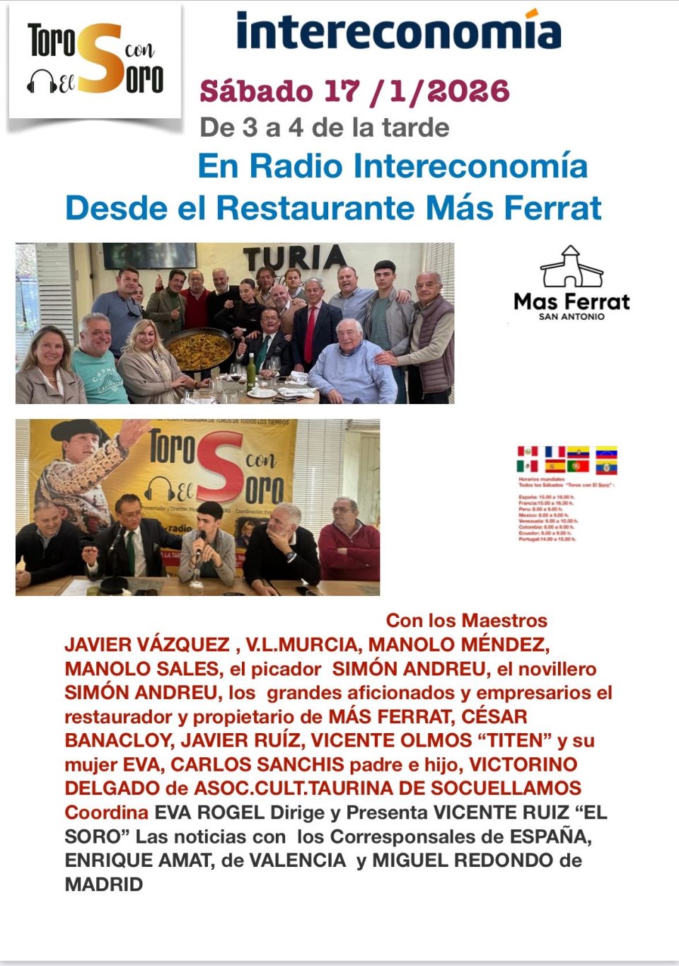 El programa “Toros con el Soro” de Radio Intereconomía se emite hoy sábado 17 de enero de 2026 de 3 a 4 de la tarde desde el restaurante Mas Ferrat. Con la participación de JAVIER VÁZQUEZ, V.L.MURCIA, MANOLO MÉNDEZ, MANOLO SALES, el picador SIMÓN ANDREU y el novillero SIMÓN ANDREU. También aficionados y empresarios como el restaurador y propietario de MÁS FERRAT CÉSAR BANACLOY, JAVIER RUÍZ,…