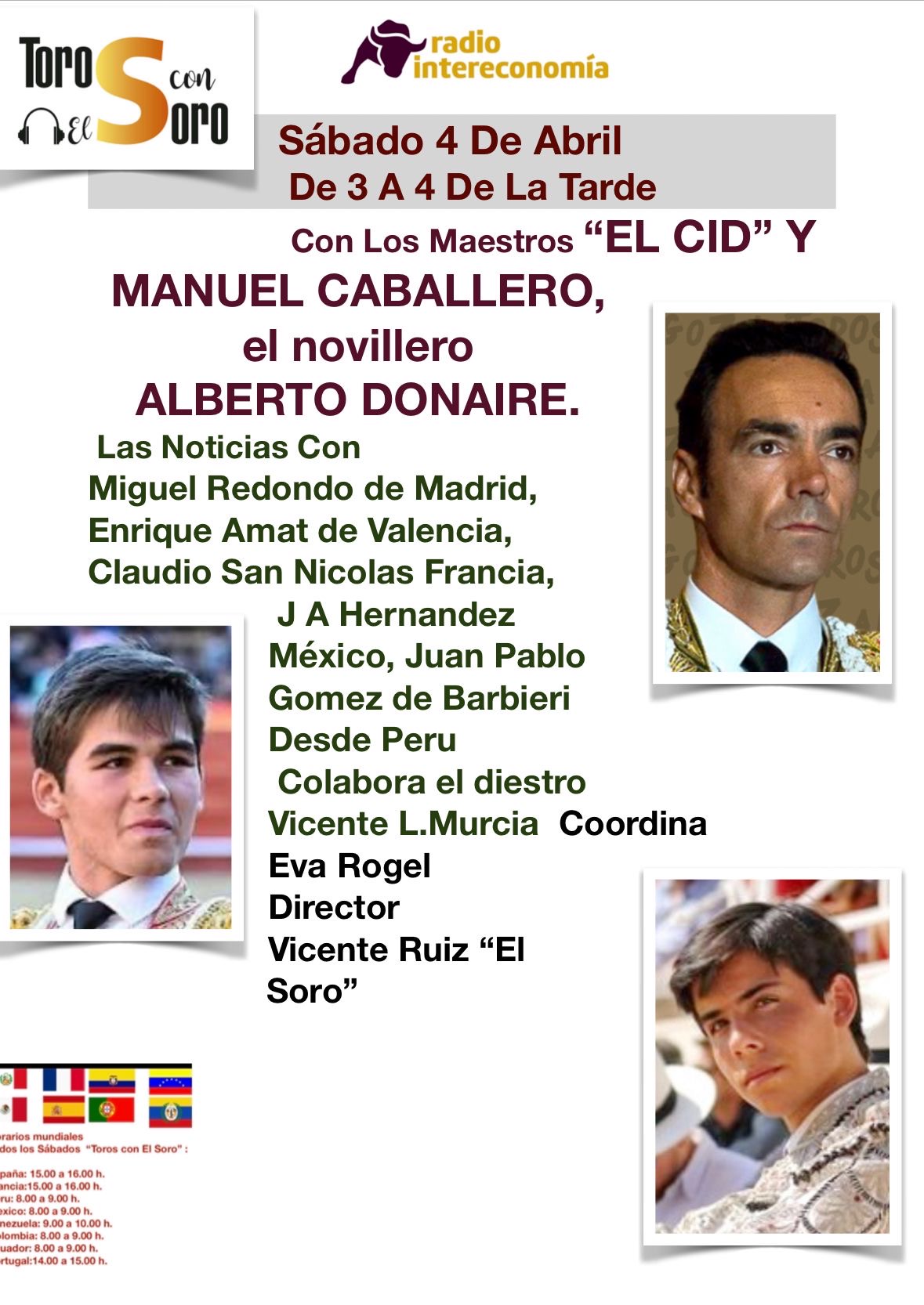 El programa “Toros con el Soro” de Radio Intereconomía se emite hoy sábado 4 de abril de 2026 de 3 a 4 de la tarde. Con entrevistas a "EL CID" Y MANUEL CABALLERO y el novillero ALBERTO DONAIRE. Las noticias con Miguel Redondo de Madrid, Enrique Amat de Valencia, Claudio San Nicolas Francia, J A Hernandez de México, y Juan Pablo Gomez de Barbieri desde Peru. Colabora el diestro Vicente L.Murcia Coordina EVA ROGEL Dirige: VICENTE RUIZ "EL SORO"