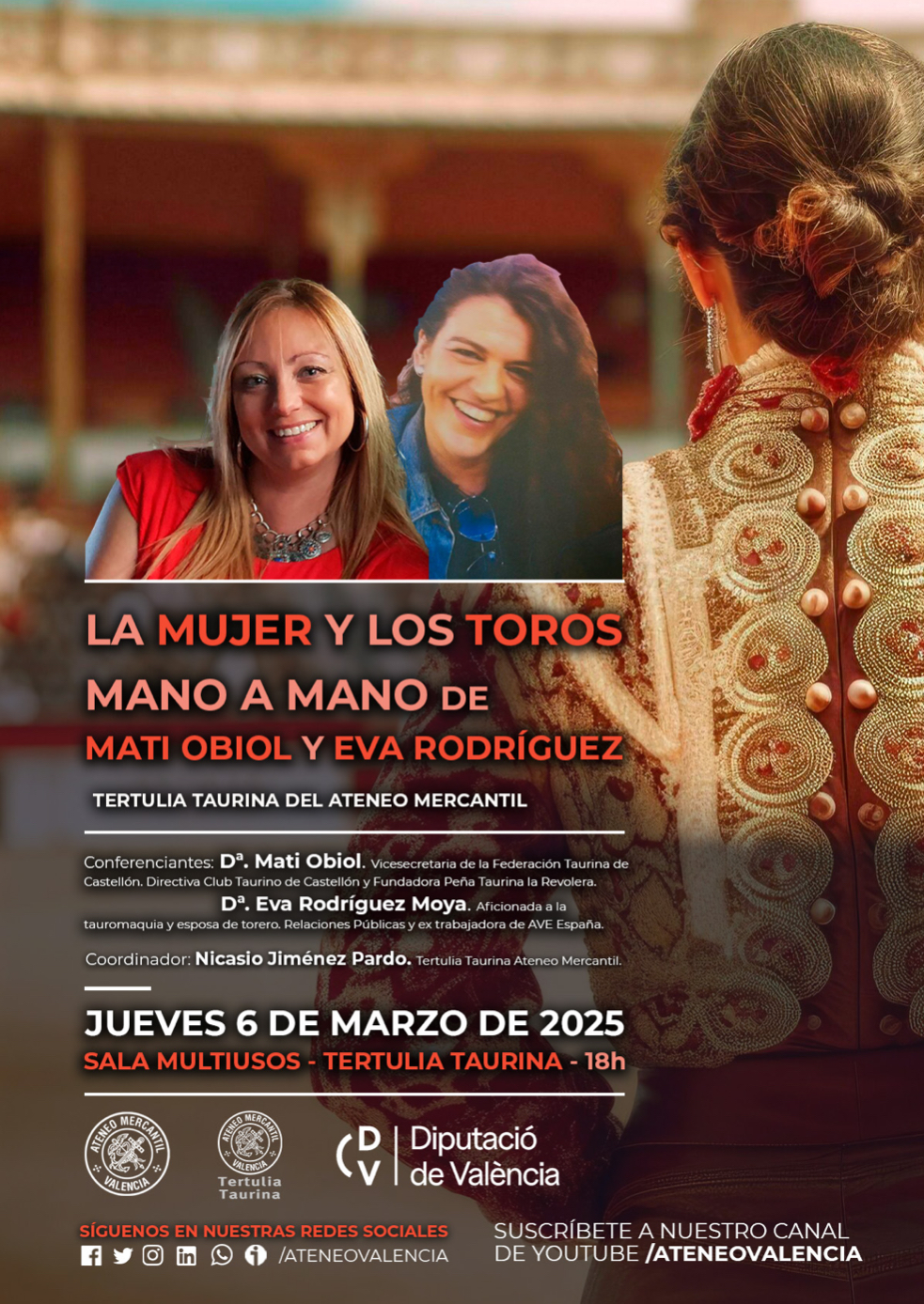 La Tertulia Taurina del Ateneo Mercantil programa la conferencia "La mujer y los toros", con un mano a mano entre dos mujeres profundamente vinculadas al mundo taurino: Mati Obiol y Eva Rodríguez. Serà el jueves, 6 de marzo de 2025 a las seis de la tarde en Sala Multiusos-Tertulia Taurina (7º piso del Ateneo). Con excelente criterio, el acto ha adelantado su hora de comienzo, para que los aficionados que lo deseen, puedan acudir posteriormente a las 19.30 a Tinto y Oro para la presentación del libro "Elrefugio de mis sentimientos" de Julián Maestro. La entrada es libre y gratuita hasta completar aforo. Todas las mujeres que asistan a este encuentro recibirán un detalle taurino como recuerdo de su paso por la Tertulia Taurina del Ateneo. Este evento será una oportunidad única para debatir sobre el papel de la mujer en la tauromaquia, un mundo tradicionalmente dominado por los hombres, pero en el que las mujeres han ido ganando presencia y reconocimiento a lo largo de los años. Desde aficionadas y críticas taurinas hasta ganaderas, apoderadas y toreras, la figura femenina ha sido fundamental en la evolución de la tauromaquia. A través de las experiencias de las invitadas, se abordará cómo ha sido su camino dentro de este ámbito, los desafíos a los que se han enfrentado y el impacto que han tenido en la cultura taurina. La tertulia permitirá conocer más sobre el esfuerzo, la pasión y el compromiso de las mujeres que han luchado por abrirse camino en este arte, reivindicando su espacio y dejando huella en la historia del toreo. Ponentes: …