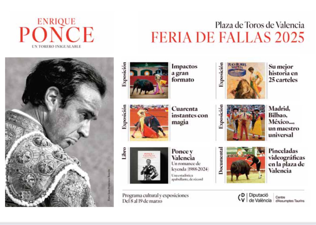 Entre los próximos días 8 y 19 de marzo, la plaza de toros de Valencia se convertirá una vez más en un auténtico museo taurino y albergará un buen número de exposiciones sobre Enrique Ponce. Con la organización del Centro de Asuntos Taurinos de la Diputación de Valencia, y bajo el título "Enrique Ponce, un torero inigualable", El aficionado podrá visitar las muestras: - Impactos a gran formato - Su mejor historia, en 25 carteles - Cuarenta instantes de magia. - Madrid, Bilbao, México… Un maestro universal Y también se podrá visionar un documental titulado "Pinceladas videográficas en la plaza de Valencia" y se presentará el libro titulado "Ponce y Valencia, un romance de leyenda (1988 2024).