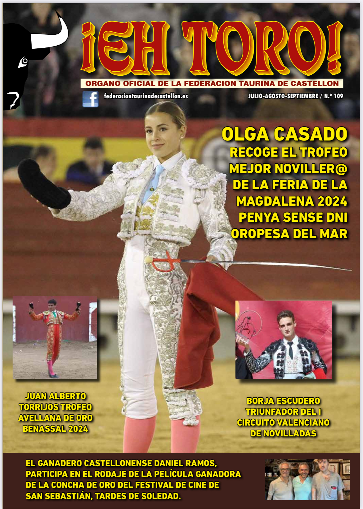 La Federación Taurina de Castellón acaba de sacar un nuevo número de su revista EH TORO!, el 109 correspondiente al trimestre de los meses de julio, agosto y septiembre. Tras un artículo de la jefa de prensa, Mati Obiol, Juanvi Puchol, el presidente de la entidad, escribe una editorial. Mati Obiol firma un reportaje sobre la celebración del I circuito valenciano de Novilladas. José Barreda hace la crónica del festejo celebrado en Benassal correspondiente al Trofeo Avellana de oro que se llevó a sus vitrinas el alumno de la escuela de tauromaquia de Valencia Juan Alberto Torrijos. Y también escribe sobre la celebración de la semana cultural del Club Taurino Manolo Molés de Benasal. Jacobo Silvestre hace la crónica de la entrega, por parte de la peña Sense DNI de Oropesa, del trofeo a la mejor novillera de la Feria de la Magdalena a Olga Casado. Y de la entrega a la escuela de tauromaquia de Castellón de la medalla de oro de la Peña cultural taurina La chicuelina de Onda. Pedro Mileo recoge la entrega a Javier Sánchez Araujo del premio al mejor puntillero de la Magdalena 2024 entregado por la Unión de aficionados La Puntilla. Mati Obiol escribe la crónica de la novillada celebrada en Utiel, donde se dieron cita hasta tres ganaderías de Castellón y Enrique Amat hace lo propio conla crónica de la novillada celebrada en Venta del Moro el 20 de octubre. Y también escribe un artículo sobre la entrega de la Concha de oro del festival de San Sebastián a la película "Tardes de soledad". También se contiene una nueva sección titulada "El color del pañuelo", en la que, a través …