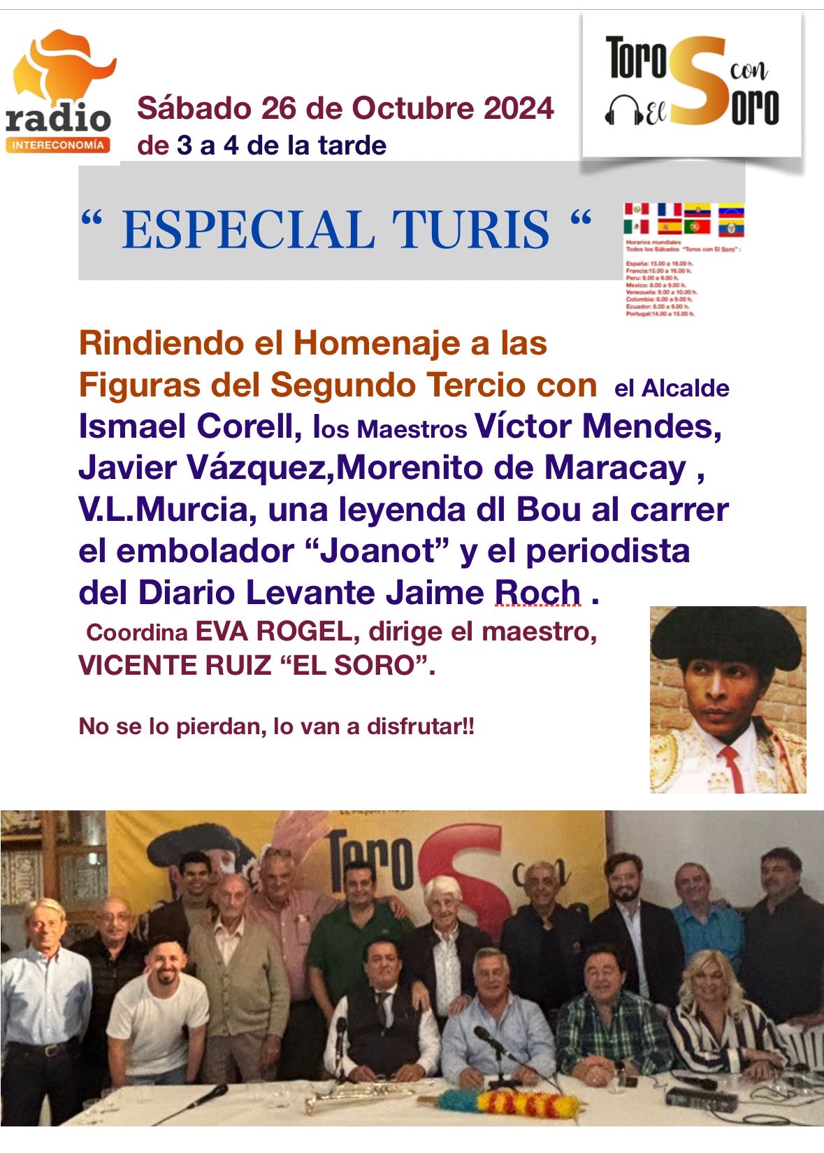 Hoy sábado 26 de Octubre, de 3 a 4 de la tarde, el programa «Toros con El Soro" rinde homenaje a las figuras del Segundo Tercio con el alcalde Ismael Corell, los maestros Víctor Mendes, Javier Vázquez, Morenito de Maracay, así como Vicente Luis Murcia, una leyenda del Bous al Carrer como el embolador "Joanot" y el periodista Jaime Roch. Coordina EVA ROGEL, dirige VICENTE RUIZ "EL SORO".