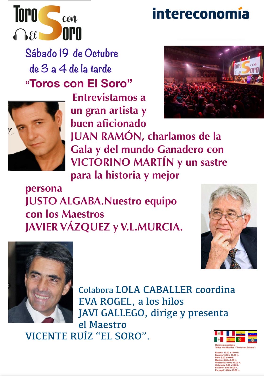 Hoy sábado 19 de Octubre, de 3 a 4 de la tarde «Toros con El Soro". Entrevistamos a un gran artista y buen aficionadoJUAN RAMÓN, charlamos de la gala y del mundo ganadero con VICTORINO MARTÍN y un sastre para la historia y mejor persona JUSTO ALGABA. El equipo con los maestros JAVIER VÁZQUEZ y V.L.MURCIA. Colabora LOLA CABALLER, coordina EVA ROGEL, a los hilos JAVI GALLEGO, dirige y presenta VICENTE RUÍZ "EL SORO"