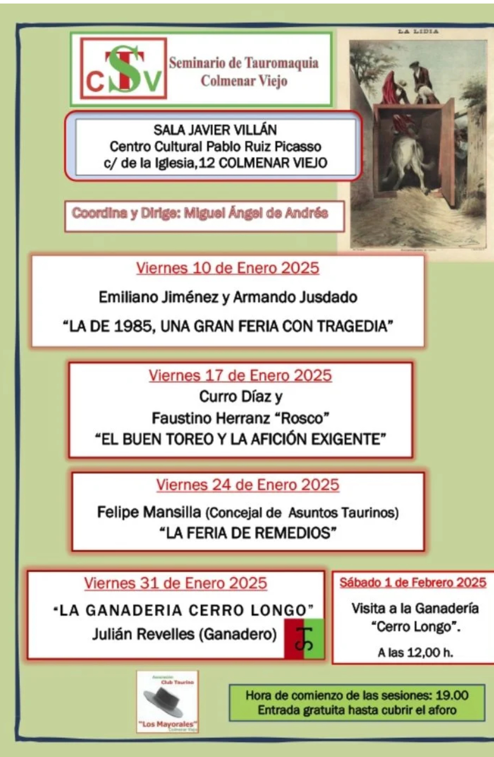 El Centro Cultural Pablo Ruiz Picasso de Colmenar Viejo está siendo escenario del Seminario de Tauromaquia 2025, un evento que reúne  cada viernes del mes de enero a expertos, aficionados y figuras destacadas del mundo taurino. Bajo la coordinación de Miguel Ángel de Andrés, el seminario es un espacio de reflexión sobre la historia, el arte y la actualidad de la tauromaquia.