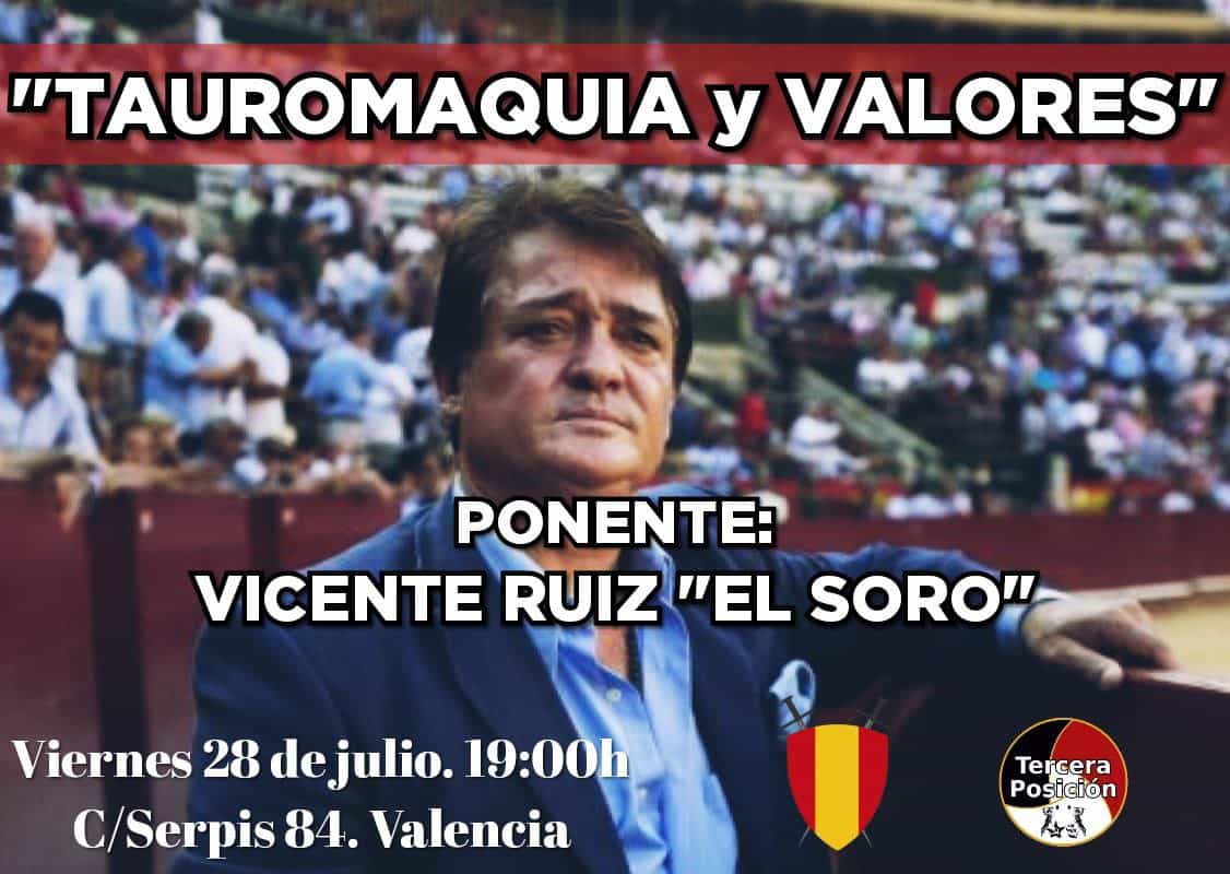 Espacio alternativo “La Resistencia” sito en la calle Serpis 84 de Valencia, en el marco de “Los Tardeos de la Tercera Posición” el torero Vicente Ruiz “El Soro”, hablará sobre la historia de la tauromaquia en España y los valores que transmite en nuestra sociedad.