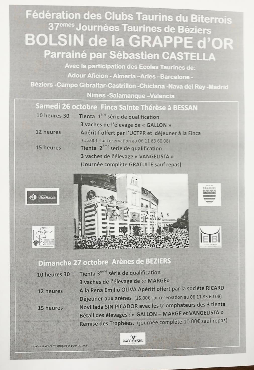 El sábado 26 de octubre, en la finca Santa Teresa, tendrán lugar las primeras series de calificación, con astados de Gallon  y Vangelista. El domingo 27, en la plaza de toros de Beziers se celebrará la tercera tienta de clasificación con erales de Margé. Y por la tarde habrá una novillada sin picadores con los triunfadores de las tres tientas, en la que se lidiarán novillos de cada uno de las tres ganaderías lidiadas en las tientas.