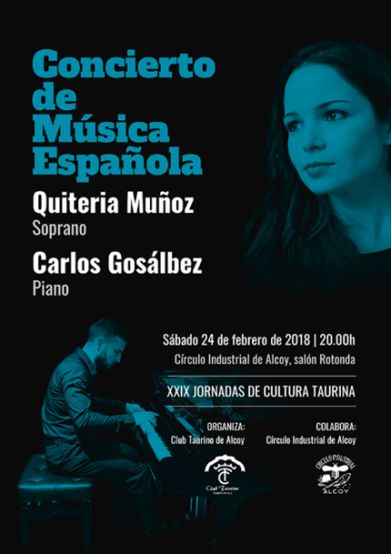 El Club Taurino de Alcoy, uno de los de mayor raigambre y solera de España, creado en el año 1923, concluye sus XXIX Jornadas Culturales Taurinas. mañana sábado, 24 de febrero, con un concierto de música española de piano y canto que se celebrará en el Salón Rotonda del Círculo Industrial de la ciudad. Al piano actuará Carlos Gosálvez y cantará a la soprano Quiteria Muñoz.