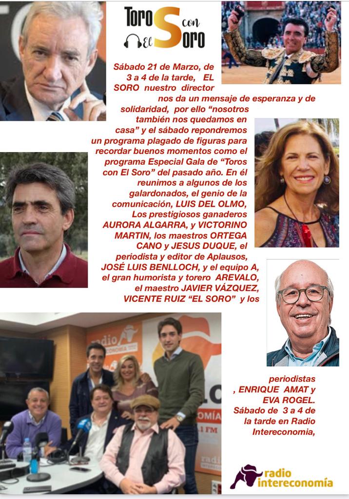 El programa Toros con el Soro, que se emite este sábado de 15:00 a 16:00 horas en Radio Intereconomía, y que dirige Vicente Ruiz El Soro junto a la periodista Eva Rogel, tendrá como objetivo dar ánimo y esperanza a todos los aficionados en estos momentos duros que se están viviendo con el Coronavirus. Ese será el contenido del mensaje que enviará a todos los oyentes el director del programa.