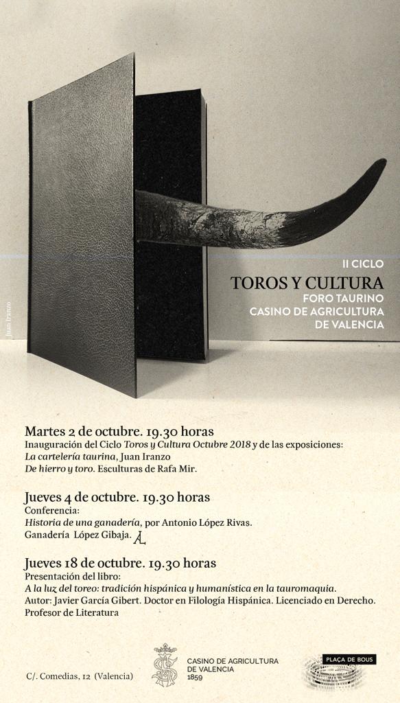 Se trata de un programa de tres actos, enmarcados bajo el título “II CICLO TOROS Y CULTURA FORO TAURINO CASINO DE AGRICULTURA DE VALENCIA”.