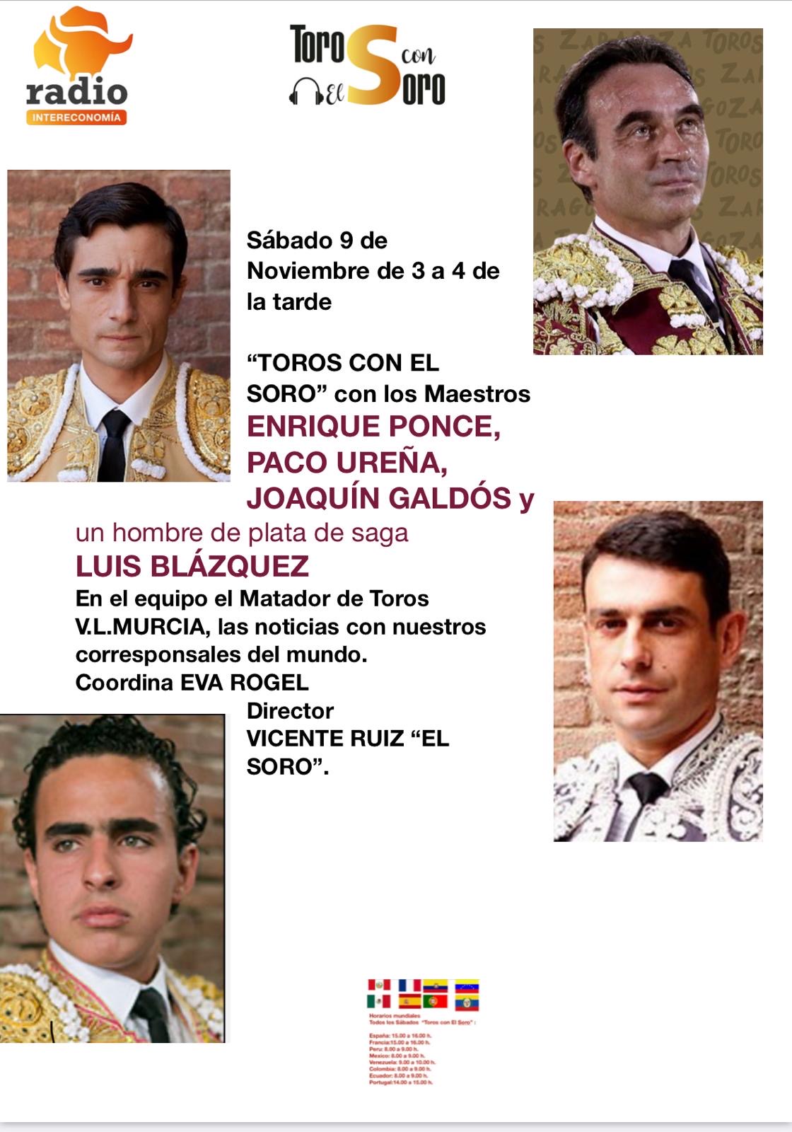 Hoy sábado, 9 de Noviembre de 3 a 4 de la tarde, “TOROS CON EL SORO” con Enrique Ponce, Paco Ureña, Joaquín Galdós y el torero de plata Luis Blázquez.