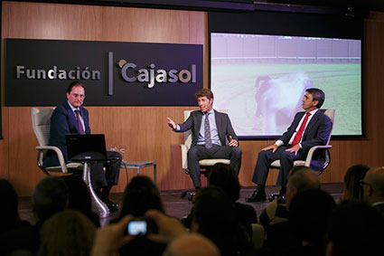 La segunda edición de ‘El toreo contado’ organizado por la Empresa Pagés colgó el cartel de ‘no hay billetes’ en la sala Antonio Machado de la Fundación Cajasol. Los protagonistas, el torero Manuel Escribano y el ganadero Victorino Martín, hablaron sobre el indulto de ‘Cobradiezmos’ del pasado 13 de abril de 2016, que se proyectó en vídeo.