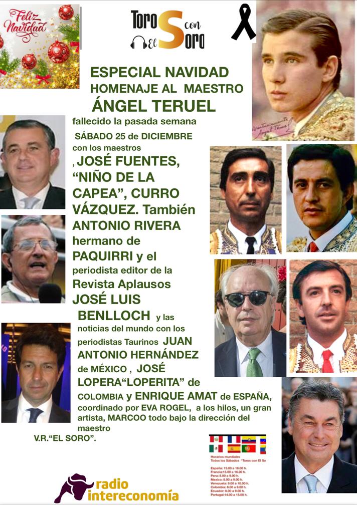 El programa “Toros con el Soro”, de Radio Intereconomía, que se emitió ayer 25 de diciembre de 15.00 a 16.00 horas constituyó un homenaje a la figura del recientemente desaparecido matador de toros madrileño Ángel Teruel. En su memoria hablarán toreros como José Fuentes, Niño de la Capea y Curro Vázquez, y también ofrecerán su testimonio Antonio Rivera, hermano de Francisco Rivera Paquirri, así como el periodista José Luis Benlloch.