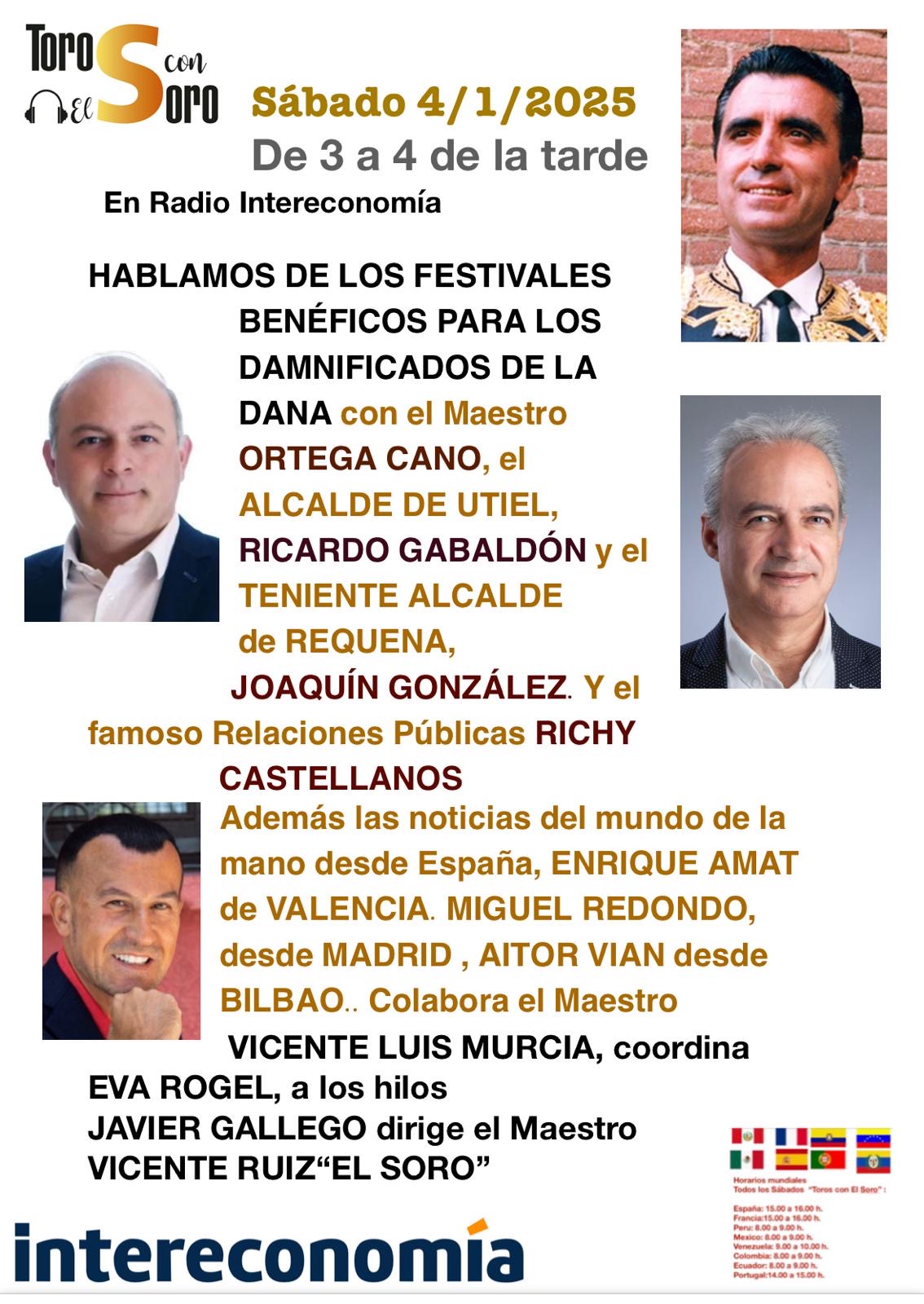 Hoy sábado, 4 de enero de 2025 de 3 a 4 de la tarde, “TOROS CON EL SORO” , hace en Radio Intereconomía un programa especial sobre LOS FESTIVALES BENÉFICOS PARA LOS DAMNIFICADOS DE LA DANA.