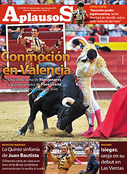 El número 2.078 de APLAUSOS ya está en los quioscos. El semanario taurino destaca en su primera página lo ocurrido en la Feria de Julio de Valencia con las grandes actuaciones de José María Manzanares, que abrió la puerta grande, Paco Ureña, heroico, así como Román.