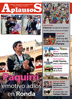 El número 2.084 de APLAUSOS ya está en los quioscos. El semanario taurino destaca en portada la corrida Goyesca celebrado el pasado fin de semana en Ronda, plaza en la que Francisco Rivera Ordóñez “Paquirri” dijo adió al toreo cortándose la coleta en presencia de sus amigos, familiares y compañeros en una tarde emotiva. Además, la actualidad pasa por los festejos celebrados en Palencia, Cuenca, Colmenar Viejo, Illescas, Madrid y Calasparra.