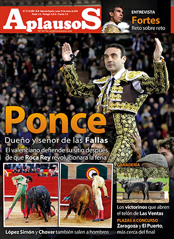 El número 2.112 de APLAUSOS ya está en los quioscos. El semanario taurino se hace eco en portada de todo lo acontecido en la Feria de Fallas de Valencia con los triunfos de Enrique Ponce, que salió a hombros dos tardes seguidas, López Simón, Roca Rey y Jesús Chover. La actualidad pasa también por Arnedo, con la celebración de una corrida de toros y la final de Zapato de Plata.